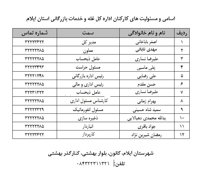 نشاني : ایلام، بلوار شهید بهشتی، کنارگذر بهشتی، اداره غله و خدمات بازرگانی استان ایلام